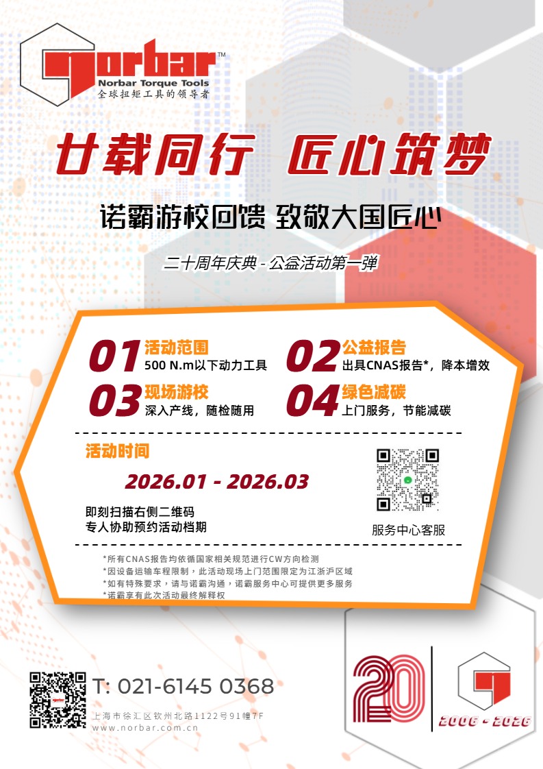 时光荏苒,2026年恰逢诺霸上海成立二十周年之际。廿载同行,诺霸为中国市场的腾飞而自豪,为经销商与终端客户长期以来的信任与支持而感动。值此里程碑时刻,为响应国家高质量发展号召,以实际行动助力制造业品质升级,诺霸重磅推出 “廿载同行・匠心筑梦” 公益游校活动 —— 这是史无前例的行业创举,更是诺霸回馈社会、赋能产业的责任担当!从未有企业愿为回馈社会投入如此雄厚的技术资源与人力成本,诺霸以“零费用、高规格、上门服务” 的极致诚意,为客户提供500Nm以下动力工具的上门校准服务,并附赠CNAS认可检测报告,以匠心致敬中国制造的卓越追求,以精准之力夯实高质量发展根基。